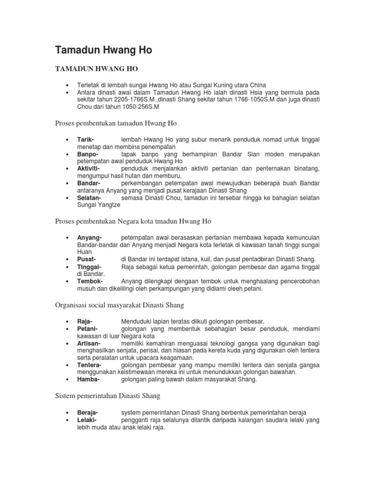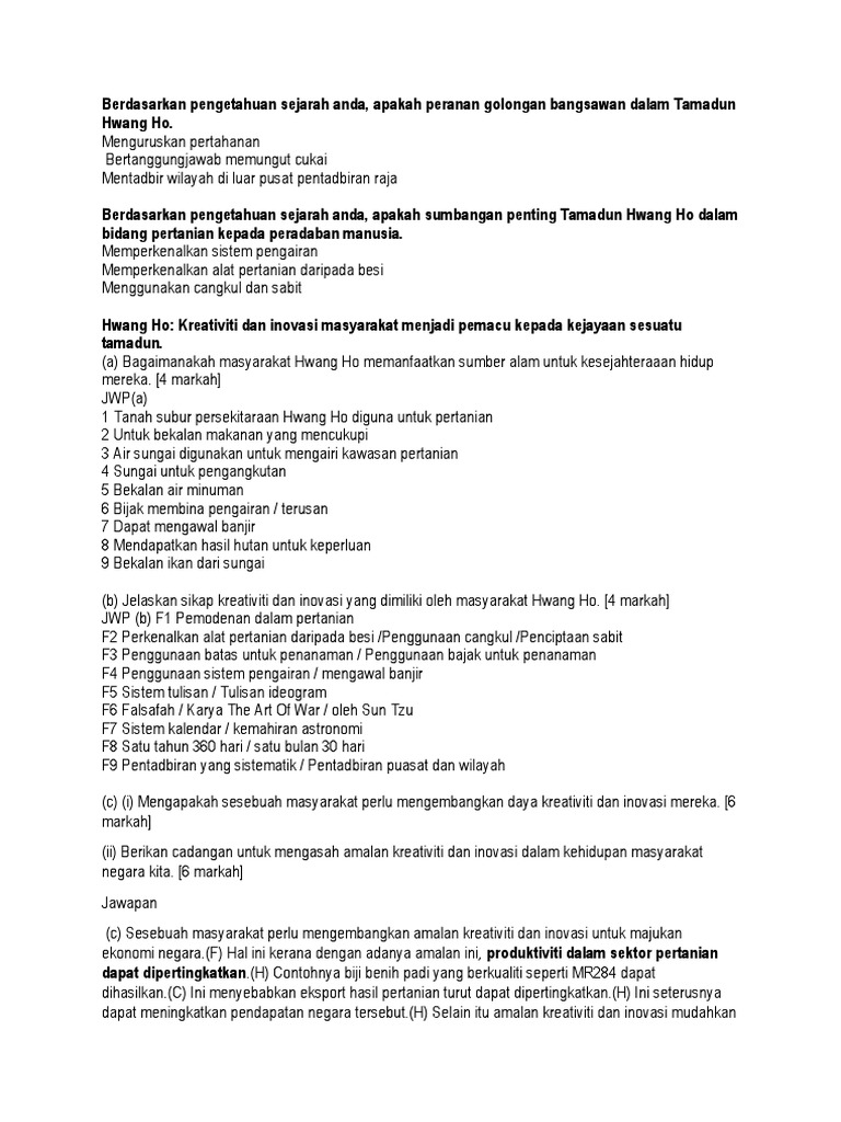 Sejarah Tajuk Tamadun Hwang Ho habit currently. F1 Dinasti Hsia F2 Dinasti Shang F3 Dinasti Chou F4 Dinasti Ching F5 Dinasti Chin 2-Nyatakan sumbangan tamadun Hwang Ho dalam bidang pertanian. Read Book Soalan Dan Jawapan Esei Sejarah Tajuk Tamadun Hwang Ho MAKKAH Di dalam entri ini saya ingin kongsikan contoh Soalan dan Jawapan Sejarah Kertas 3 yang telah disediakan oleh guru-guru Sejarah sebagai bahan rujukan semasa menjawab kertas soalan tersebut.